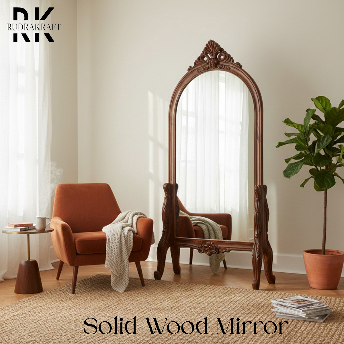 Elegant full-length mirror crafted from solid wood with intricate carvings, perfect for dressing and enhancing your décor.