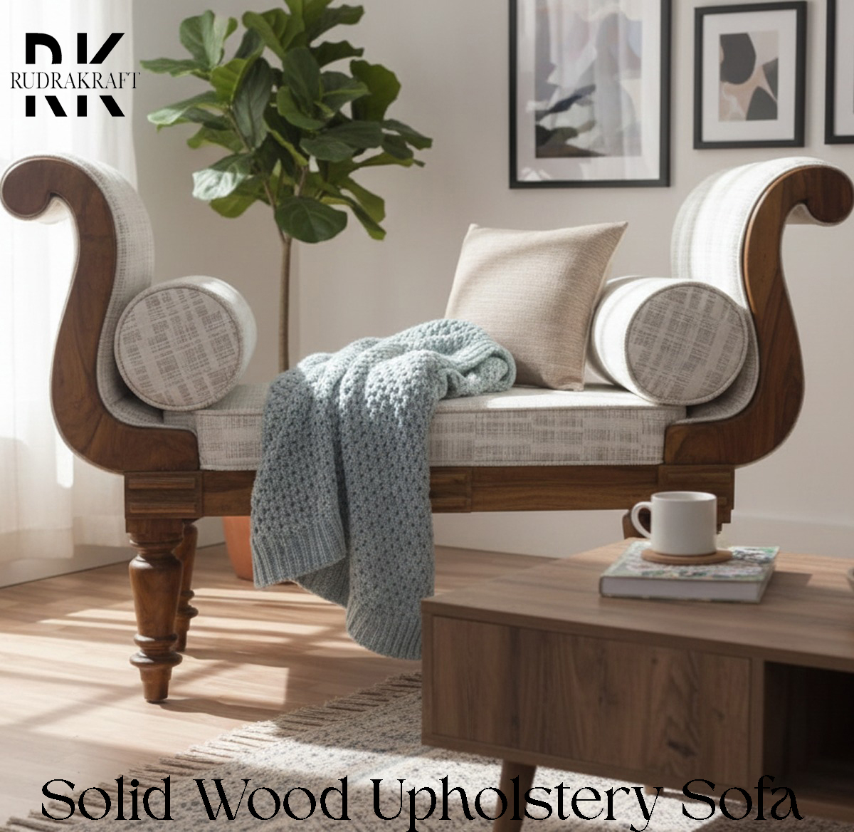 Elevate your living space with this beautifully designed Handcrafted Solid Wood Upholstered Chaise Lounge Sofa. Crafted from high-quality solid wood, this piece features elegant curved armrests and detailed craftsmanship that adds a touch of classic luxury to any room.