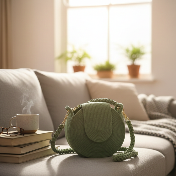 Add effortless elegance to your everyday look with this beautifully handcrafted round rope sling bag by Rudra Kraft. Designed in a soothing sage green tone with a minimal circular silhouette, this bag offers a perfect balance of modern style and traditional craftsmanship.